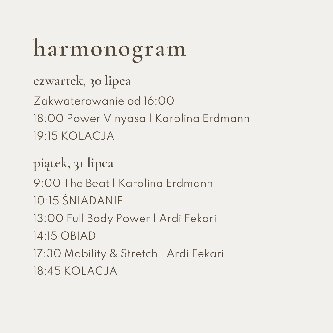 Czwartek to organizacyjny dzień, w który docierasz na miejsce i przenosisz się do nowej wyjazdowej rzeczywistości. Na start trening Power Vinyasa z Karoliną - dynamiczna vinyasa joga. Idealna sesja na rozruszanie po podróży, uspokojenie układu nerwowego i pierwsze złapanie oddechu.
