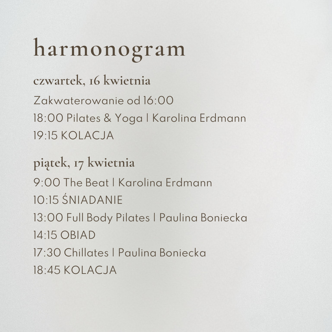 Śniadanie i dłuższy czas wolny, który będzie na wagę złota po mocnym poranku – spacery, książka, drzemka, nicnierobienie. Kolejne spotkanie na macie? Power Pilates z Pauliną. Klasyczne pilatesowe punkty połączone z dodatkową dawką wzmacniania dla naszych nóg, pośladków oraz brzucha.